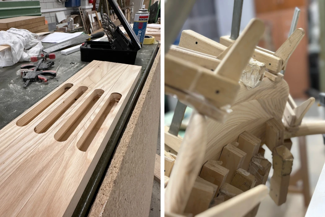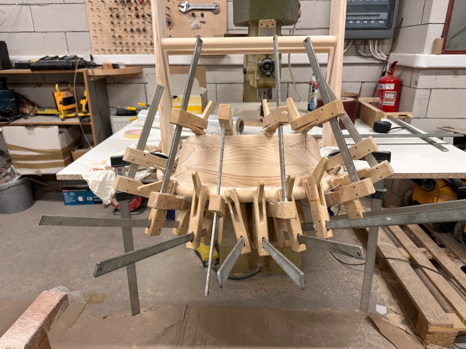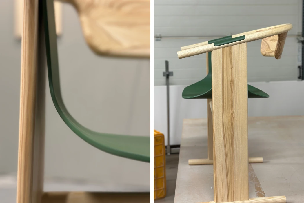 A STRETCH szék háttámlája ragasztás közben, ahogyan a karfához illesztik a támlát