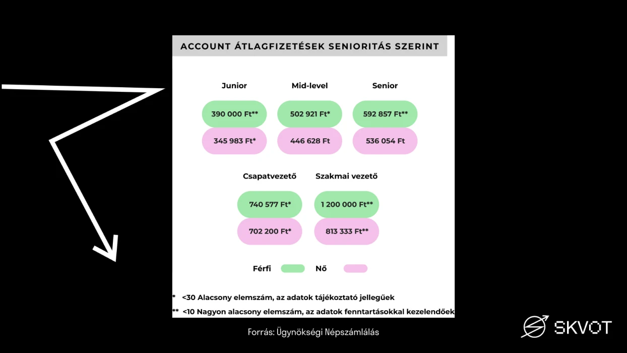 Az alkalmazottaknál a legalacsonyabb bér 322 857 Ft (junior social/content), a legmagasabb pedig 2,2 millió (traffic/operations manager szakmai vezető). Érdekes, hogy 4 munkakörben (grafikus/UI; account/CS; social/content; PR) mid-level szinten is az adatfelvételkori, 2024. novemberi teljes állásos nettó magyar átlagbér (478 ezer) alatt vannak a bérek, de az art director juniorként is megelőzi azt, a legtöbb, 8 esetben pedig a mid-level előzi először meg. Mi a jelentős bérkülönbségek oka?