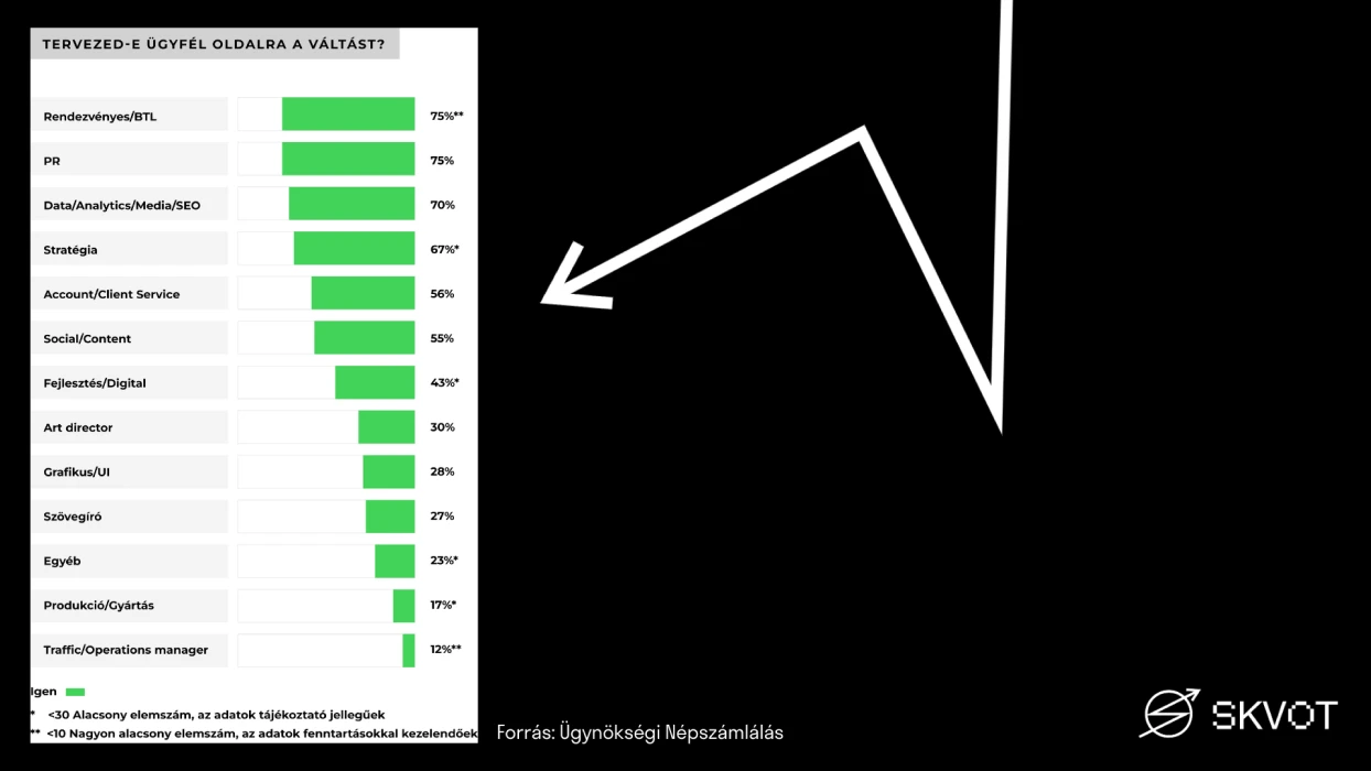 NL: Ezt támasztja alá egy másik adat is, hogy ki miért váltana ügynökséget. A kisebb ügynökségeknél dolgozóknál magasabb az aránya azoknak, akik a szakmai színvonal miatt váltanának – valószínűleg pont azért, mert ő ott egy magasabb poziban van, amihez lehet, hogy egy magasabb fizu társul. De inkább elmegy adott esetben a szenior szintről egy mid-level szintre egy nagyobb ügynökséghez, ahol komolyabb vagy nagyobb ügyfeleken dolgozhat, és beáldozza azt a fizetési különbséget, ami a poziból eredhet. Emiatt is van.