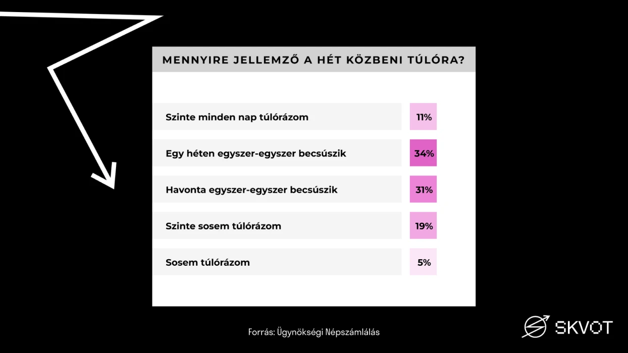 NL: A work-life balance egyik legnagyobb ellenfele nyilván a túlóra. A kutatásból kiderül, hogy mindenhol jelen van, ami meglepő, hogy nagyon magas, 46 százalék volt azok aránya, ahol nincsen semmilyen kompenzáció. Ami azért ássa alá az egészet, mert egy rossz trackre viszi a működést, és az ügynökség szinte érdekelt abban, hogy túlórázz.