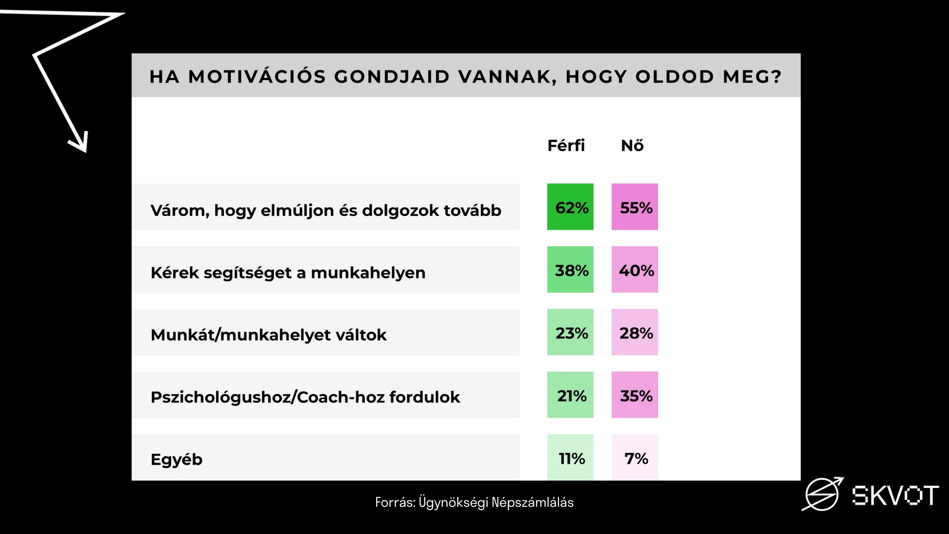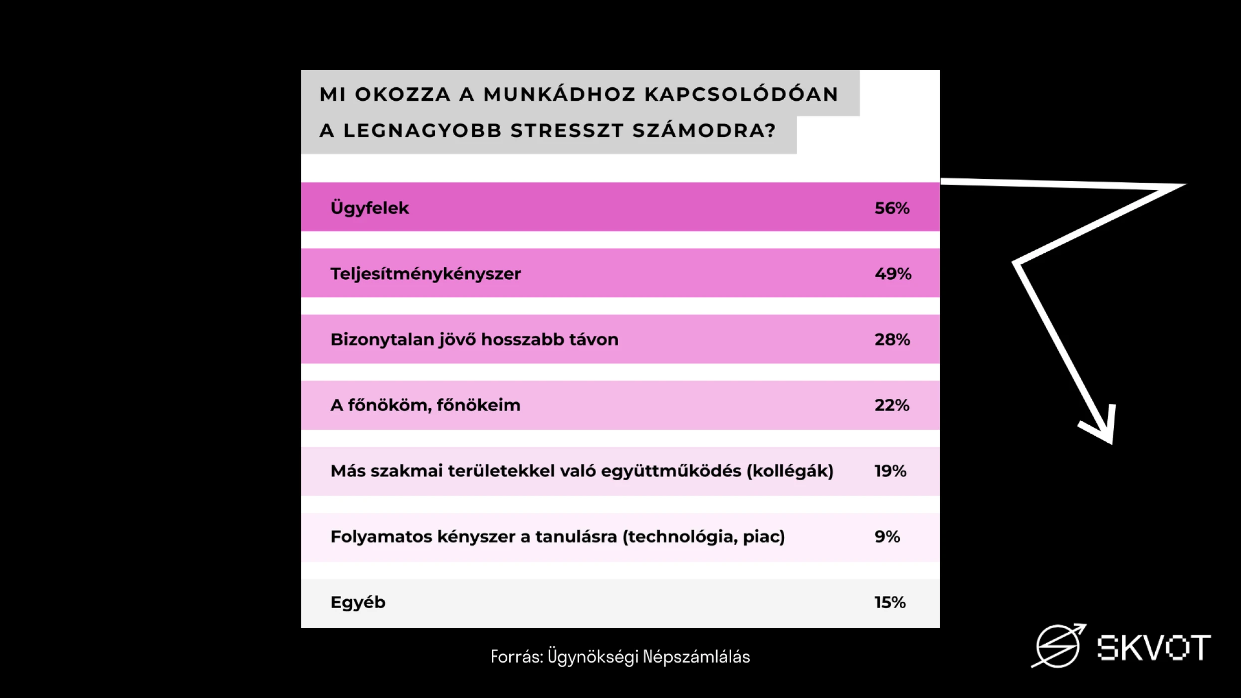 NL: Nekem nemcsak azok az adatok voltak kicsit riasztók, amik negatív irányba változtak – például a fizetéssel való elégedetlenség vagy a külföldre vágyók –, hanem azok is, amik nem változtak. Egy csomó olyan negatív dolog van a kutatásban, ami évről évre visszajön. Milyen jó lenne, ha egyszer a stresszfaktorok között az vezetne, hogy kevés gyümölcsöt kapunk a munkahelyen, és nem az ügyfél, a kiégés és a túlmunka lennének a stresszfaktorok!