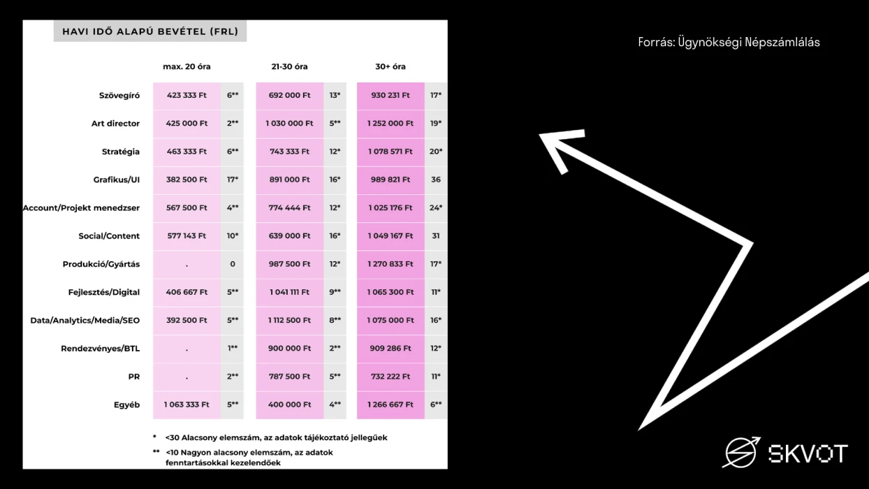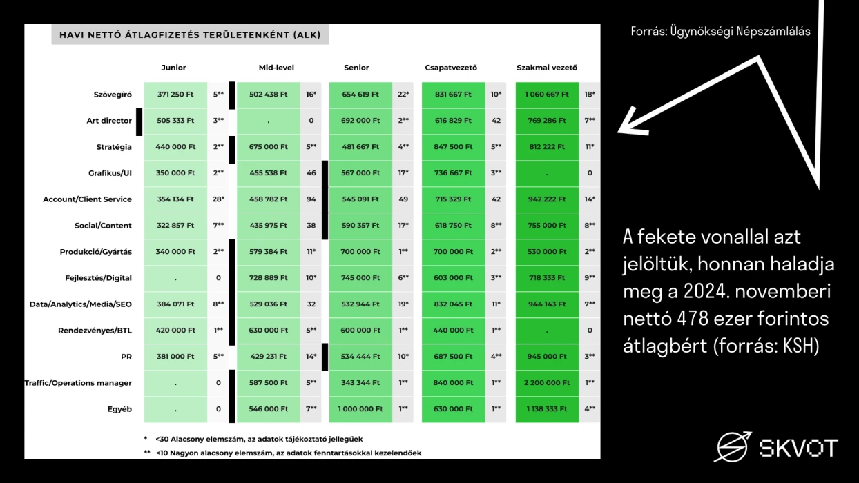 MG: Meg kell nézni, hol milyen az elemszám, ilyen anomáliák lehetnek. Illetve ha valaki egy kisebb ügynökségnél van szeniorabb pozícióban, versus egy nagyobb ügynökségnél, mid-level pozícióban, akkor simán lehet, hogy egy mid-level ember többet keres, mint mondjuk egy kis, kevésbé neves ügynökségnél lévő szenior. Ilyenek lehetnek a rendszerben. Ott van mindegyik szám mellett az elemszám, és ahol kicsi, ott egy ember is el tudja torzítani.
