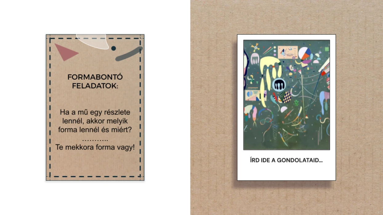 A kurzuson feladat is kollaborációt létrehozni. „Ez a kihívás számomra nagyon nagy teret nyitott ki, hogy milyen módon tudom továbbgondolni és kiterjeszteni a projektemet, milyen területeket, személyeket, eseményeket tudok összekovácsolni egy cél érdekében” – kommentálja Lencsés Andrea. „Ebben az esetben ezek a kártyajáték, a művészetterápia, a pszichológia, a múzeumpedagógia, a kortárs művészet és az alkotás” – sorolja. „A különböző pszichológiai témákra és elméletekre alapozva a játék olyan feladatokat és kihívásokat kínál, amelyek segítenek a résztvevőknek felfedezni saját érzelmi világukat, gondolataikat és viselkedésüket, miközben élvezik a művészet által nyújtott kreatív kifejezés lehetőségét” – összegzi munkáját. „Az absztrakt művészeti alkotások és a pszichológiai elméletek közös találkozása egy olyan játékot teremt, amely segít felfedezni az egyéni élmények gazdagságát és az emberi kapcsolatok mélységét.” Mint elmondta, a nyomdákba sűrített alakzatok egy konkrét művész formaelemeit ölelik fel. „Ebben a projektben Vaszilij Vasziljevics Kandinszkij műveit használtam fel. De még számos művész alkotói munkássága szóba jöhet” – teszi hozzá.