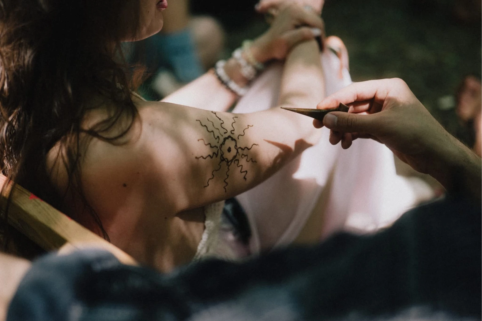 Gergővel a kézműves sátraknál beszélgettem, azt mondta, a hennára jöttek. „Körbeadták a hennát, csoportokban voltunk, mert nem volt ugye annyi. Az egyik haveromat varrtuk szét” – idézte fel. Festettek rá egy Nagy-Magyarországot és a kedvenc focicsapatát, virágokat, és ő is felkent magára egy vázát virágokkal. Emellett azt mesélte, ékszerkészítés és screen printing is volt. Utóbbi során egy pólóra olyan anyagot kennek, amely kitakarja a napot, és a végső mintát a napfény festi meg.