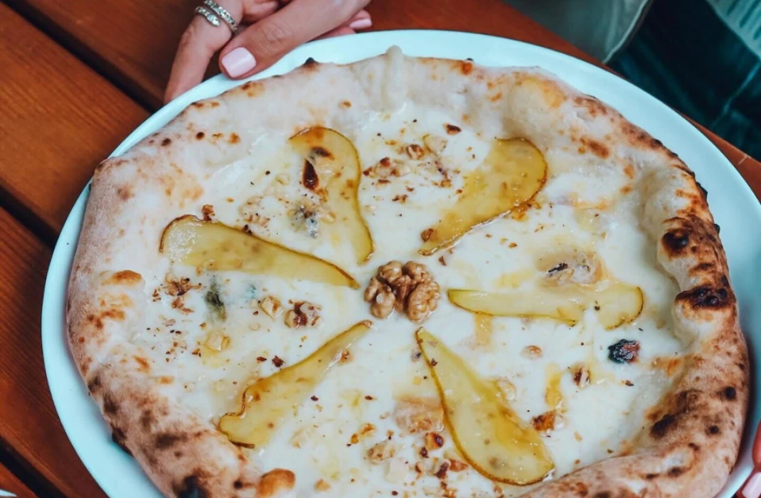 Egy pizza olykor olyan különleges feltétekkel is készülhet, mint a karamellizált körte vagy a dió. (Fotó: Fermento Pizzéria, Facebook)