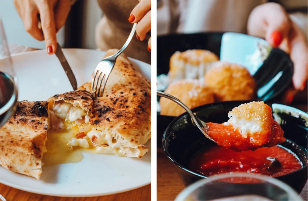 A calzone (balra) Nápolyból, az arancini pedig Szicília szigetéről származik, mindkettő a hagyományos olasz street food különlegessége. (Fotók: Fermento Pizzéria, Facebook)