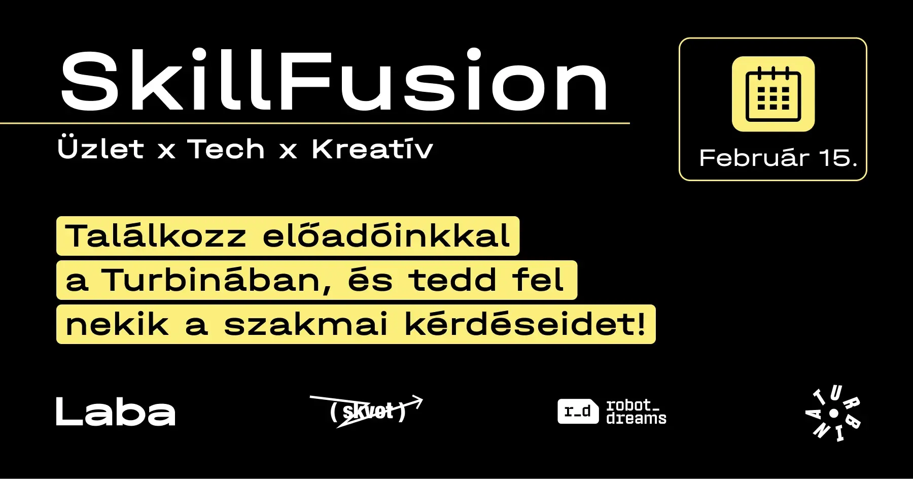 Ahogyan szakmai blogunk évzáró cikkében megígértük, 2026-ban újabb, a korábbiaknál sokkal nagyobb szabású offline eseménnyel készülünk nektek. Azóta már jó eséllyel találkoztatok is a közösségi médiában a SkillFusion: Üzlet x Tech x Kreatív című rendezvényünkkel. Ezt február 15-én tartjuk a budapesti Turbina Kulturális Központban (Vajdahunyad u. 4.), és 10 előadással, 2 kerekasztallal és 11 olyan szakemberrel várunk benneteket, akiktől kérdezhettek az „Ask Me Anything” programunkon, emellett a magyar Laba, a SKVOT és a robot_dreams szinte összes előadójával összefuthattok a helyszínen. A témák közt lesz a sokszínű csapatok ereje, az alulfinanszírozott kreatívipar, a tudatos AI-fejlesztések és a szakmák közötti átjárás is. Kapunyitás 14 órától, networking 19 óráig.